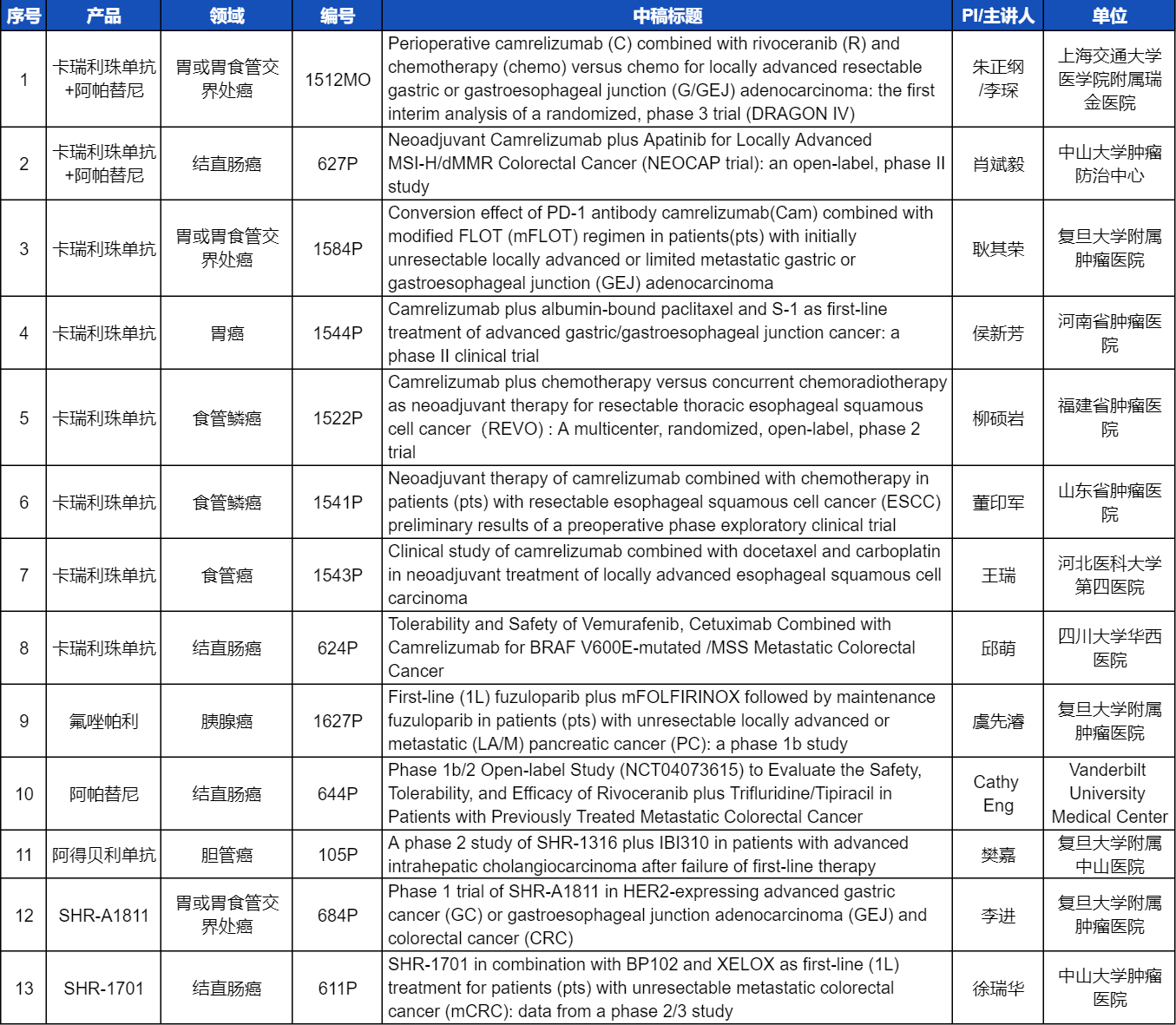 本次ESMO大会,将由中山大学肿瘤医院徐瑞华教授、广东省人民医院周清教授、中山大学孙逸仙纪念医院姚和瑞教授、上海交通大学医学院附属瑞金医院李琛教授分别就4项九游会(J9)医药创新产品相关研究做口头报告,包括SHR-1701、SHR-A2009、SHR-A1811这3款未上市创新产品的实体瘤治疗临床研究,以及1项“双艾”组合(卡瑞利珠单抗联合阿帕替尼)治疗局部晚期可切除胃/胃食管交界处癌的Ⅲ期临床试验期中分析。