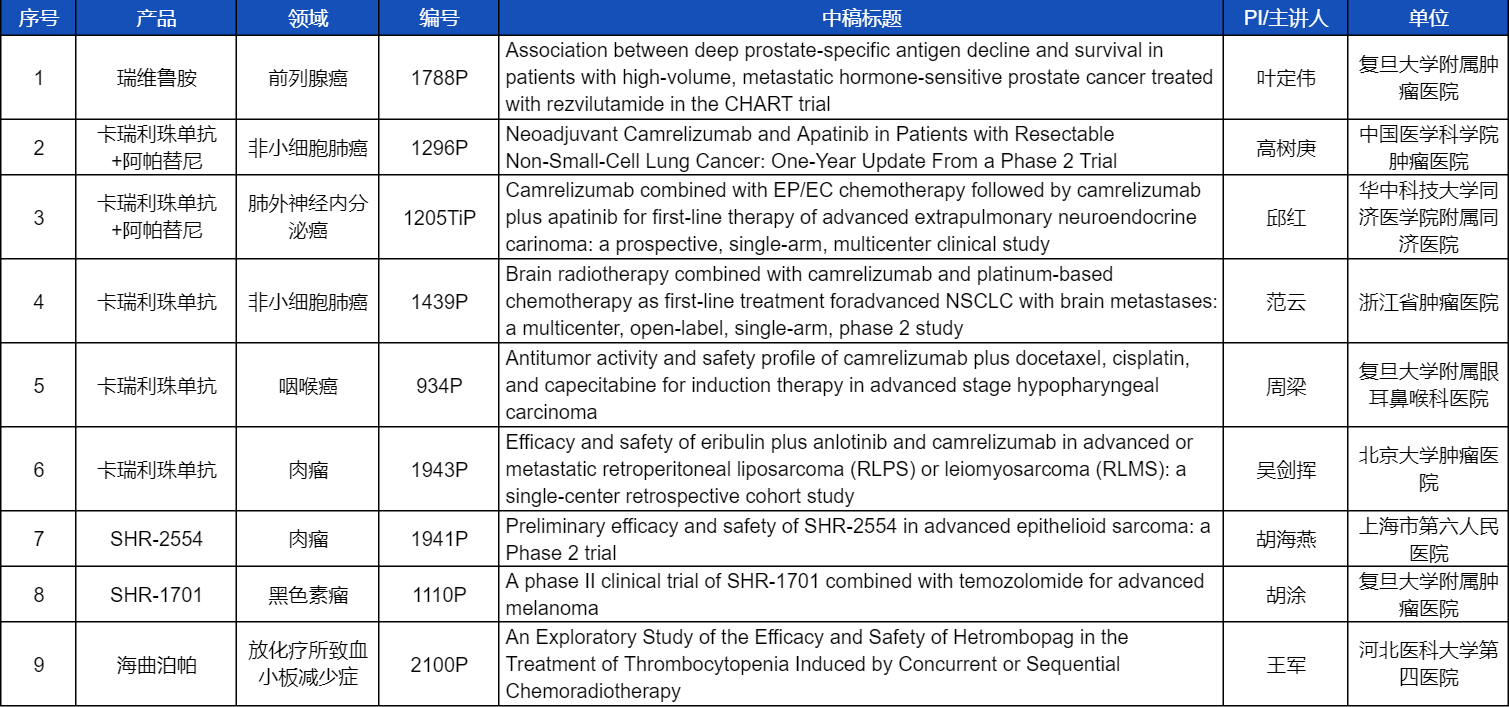 在非小细胞肺癌、咽喉癌、肉瘤、前列腺癌、黑色素瘤等多个领域,卡瑞利珠单抗、阿帕替尼、瑞维鲁胺、SHR-1701、SHR2554等创新产品相关研究一共入选了8项壁报展示。此外,九游会(J9)医药自主研发的血小板生成素受体激动剂(TPO-RA)海曲泊帕在放化疗所致血小板减少领域的探索性研究显示良好的疗效,入选壁报展示。