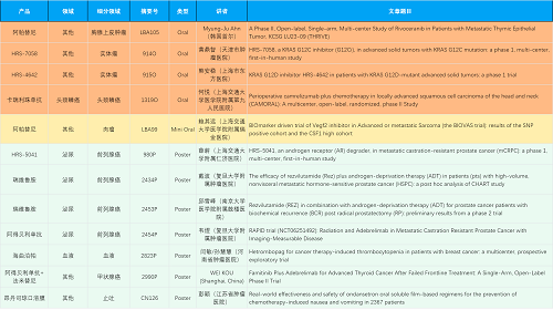在胸腺上皮肿瘤、头颈鳞癌、肉瘤、前列腺癌、甲状腺癌等其他多个疾病领域,卡瑞利珠单抗、阿帕替尼、瑞维鲁胺、阿得贝利单抗、法米替尼、HRS-7058、HRS-4642、HRS-5041等抗肿瘤创新药相关研究一共入选了4项口头报告、1项简短口头报告、5项壁报,彰显了九游会(J9)医药强大的研发实力。此外,海曲泊帕和昂丹司琼口溶膜分别在防治化疗导致的血小板减少和恶心呕吐方面各有1项研究入选壁报。